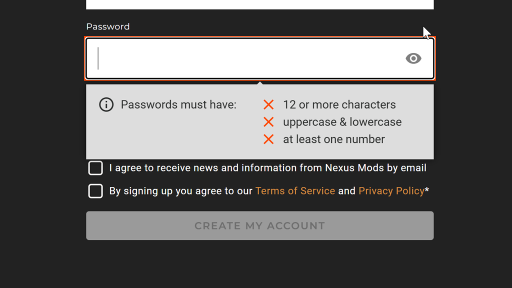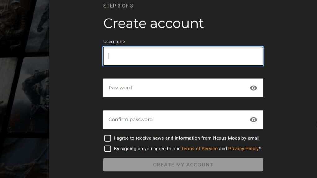 下のチェックボックス2か所(Nexus Modsからメールを受け取ることへの同意と、利用規約とプライバシーポリシーへの同意)にチェックをつけて、「CREATE MY ACCOUNT」をクリック。