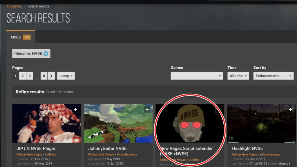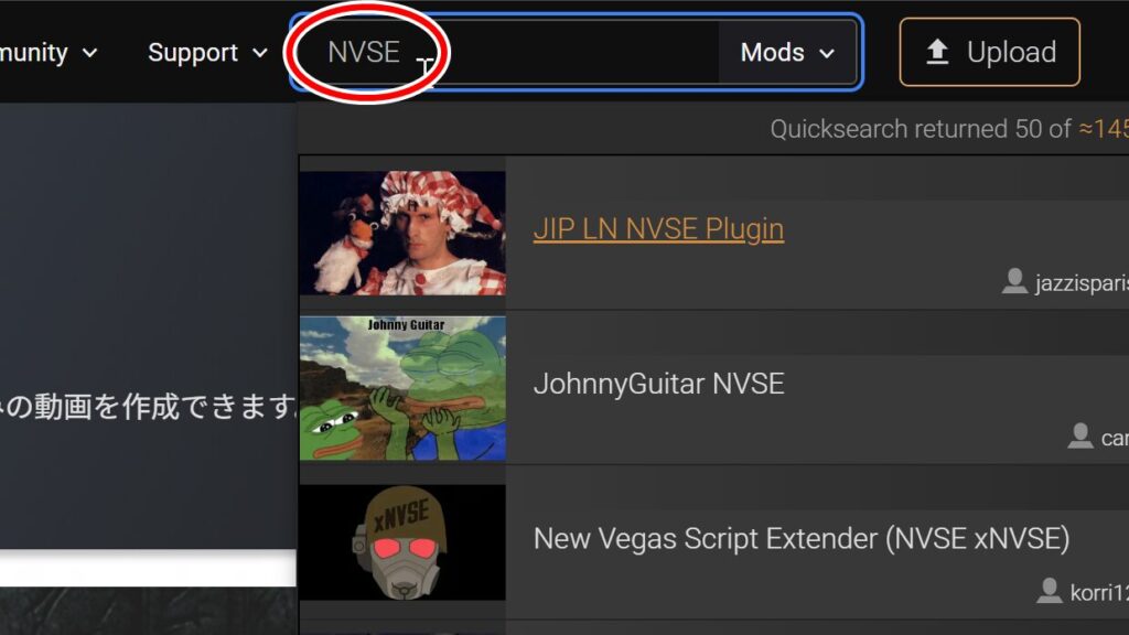 サイト上部の検索ウィンドウから、Mod名、またはゲームを選んで検索することができます。今回は「NVSE」というModをダウンロードするので、「NVSE」と入力してEnterキーを押下します。