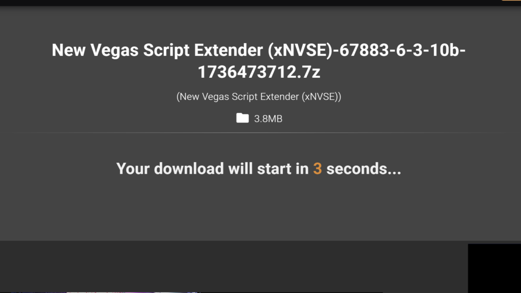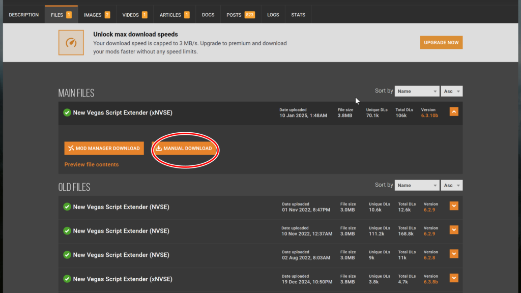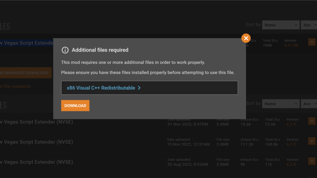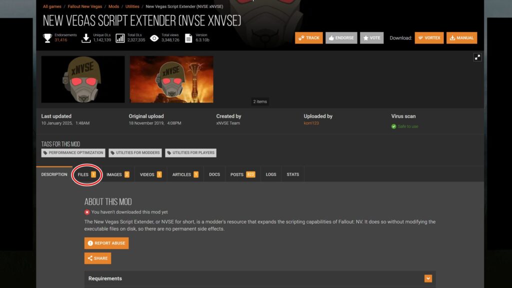 するとこのような画面になります。「MAIN FILES」の「New Vegas Script Extender (xNVSE)」をダウンロードします。オレンジのバナーの右側、「Manual Download」をクリック。