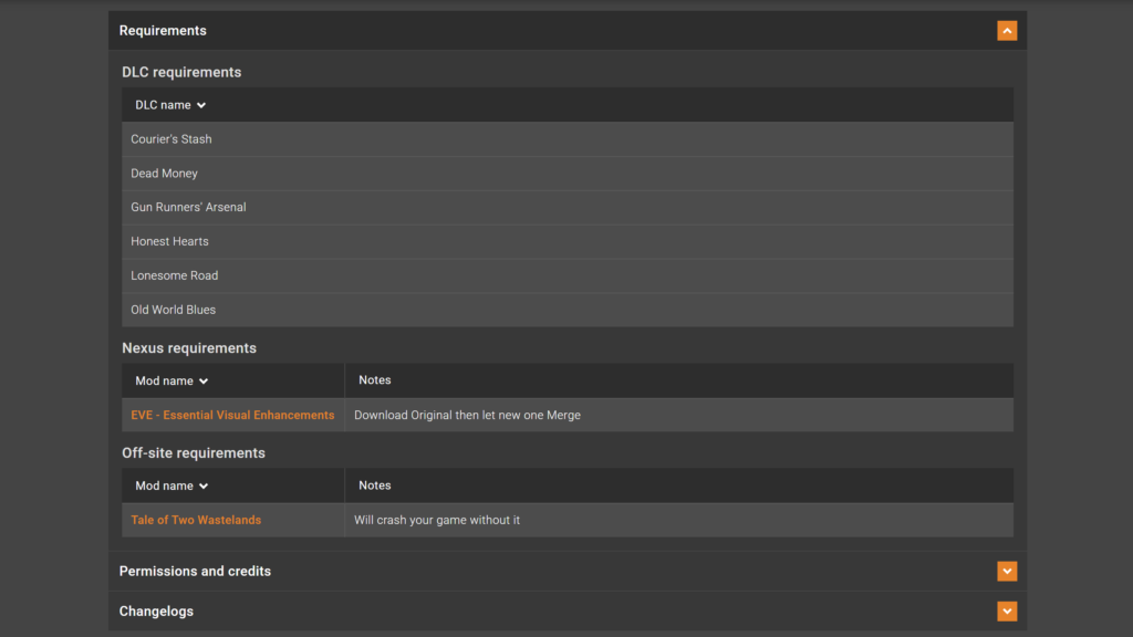 例えばあるModでは、下の画像のように、「DLC Requirements」、「Nexus Requirements」、「Off-site Requirements」に書かれている全てが必要となります。1つ目がゲームのダウンロードコンテンツ、2つ目がNexus Mods内にある別のMod、3つ目がNexus Mods以外のサイトのファイル/Modです。