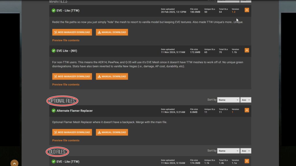 「OLD FILES」は、古いファイルでアップデート前のModになります。よほどの事情(最新アップデートに深刻なバグがある、別のModが古いバージョンを必須としている場合ななど)がない限りはダウンロードすることはありません。