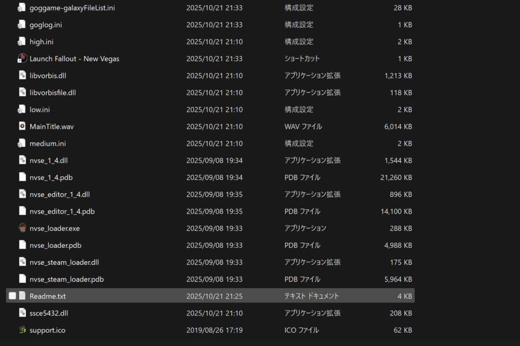 ダウンロードしたファイルを全て、FNVフォルダにコピーアンドペーストしてください。