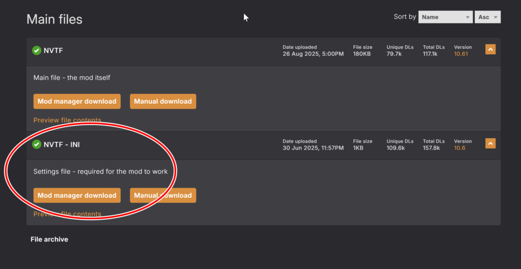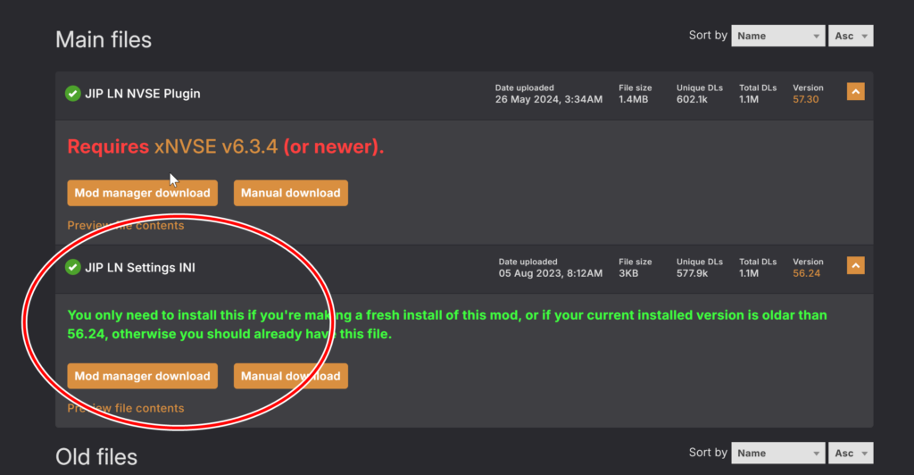 「Main files」より少し下の「Optional files」内のINIファイルも忘れずにダウンロードしましょう。