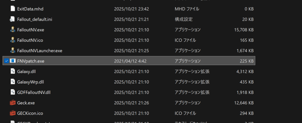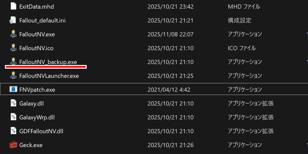 FNVフォルダ内に「FalloutNV_backup.exe」というファイルができていたら、完了です。
