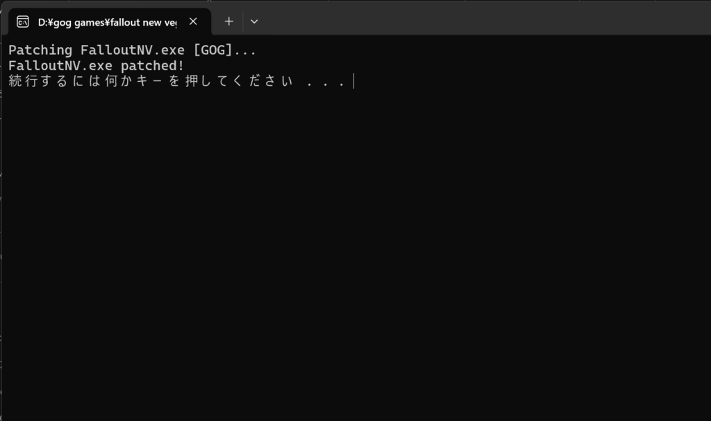 「Patcher.exe」を起動すると、上の4GB Patcherと同様に、ウィンドウが出るので、指示通りにキーを押すと、ウィンドウが閉じます。