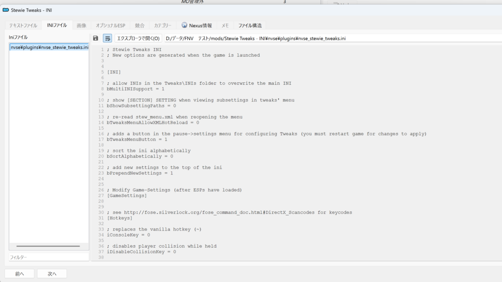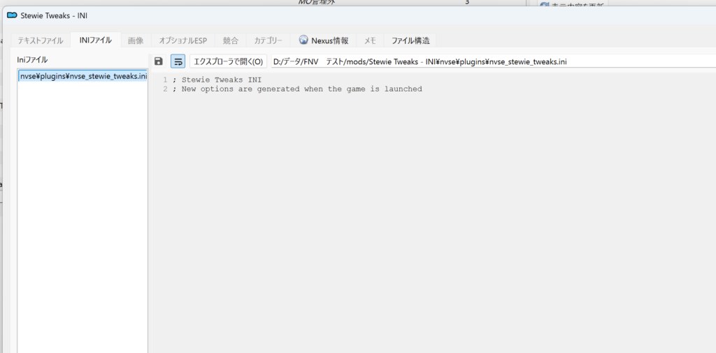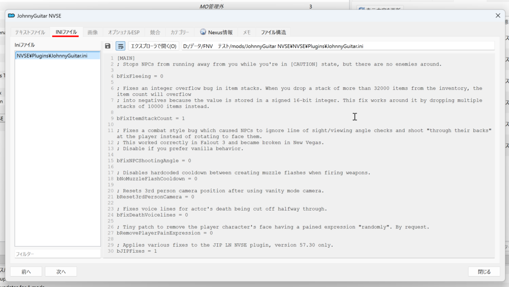 同梱されてくるINIファイル内で設定ができるので、慣れてきたら見てみてください。「Johnny Guitar NVSE」をクリック後、「INIファイル」から見ることができます。