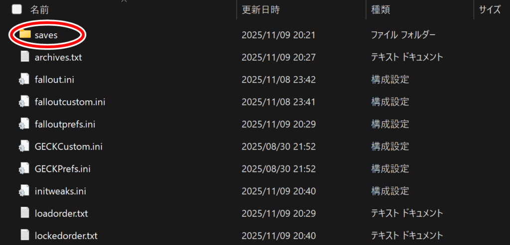 以下のように「saves」フォルダ内にセーブデータを入れたら、準備完了です。