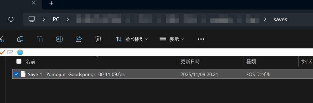 そこに、先ほどダウンロードしたセーブデータ(fosファイル)をコピーアンドペーストしてください。