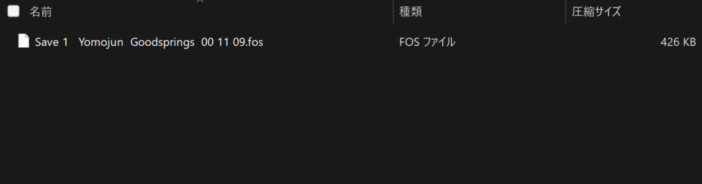 ダウンロードすると、「Save 1 Yomojun Goodsprings 00 11 09.fos」というファイルがあります。これがセーブデータです。