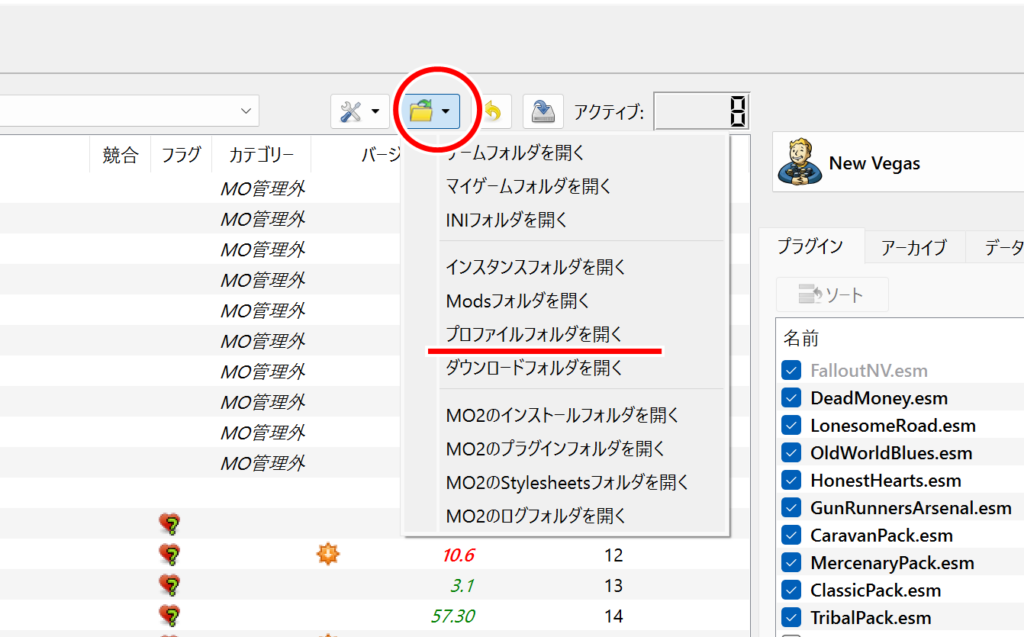 まず、MO2でフォルダアイコン(赤丸)をクリックして、「プロファイルフォルダを開く」を選択します。