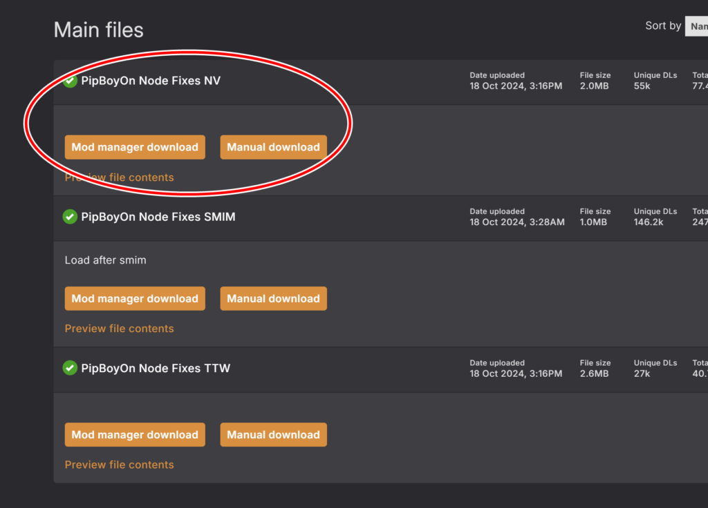 いくつかバージョンがありますが、特定のModやTTWを使わない限りは「PipBoyOn Node Fixes NV」を選びます。