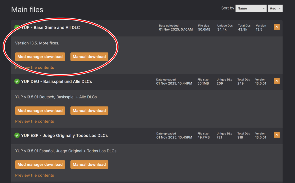 DLCを持っていない方用のファイルもありますが、このガイドを読んでいる方は、全てDLCを持っているはずですので、一番上の「YUP – Base Game and All DLC」のみをダウンロードしましょう。