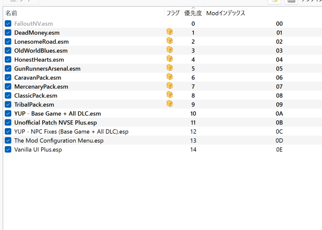チェックまで入れると、「Mod名」の項目に「Vanilla UI Plus (New Vegas)」が、左の「プラグイン」タブ内には「Vanilla UI Plus.esp」がそれぞれあるはずです。