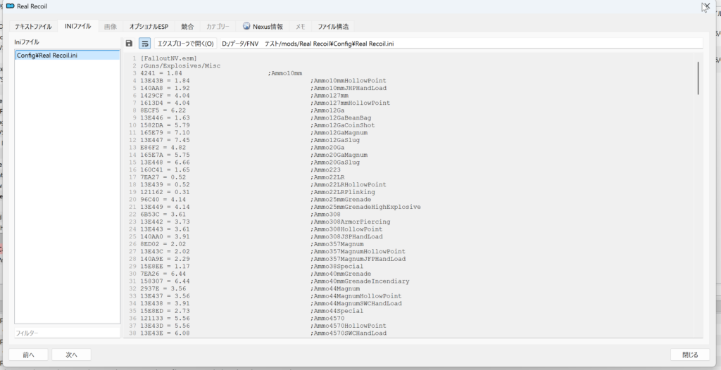 また、同梱されるiniファイルで、銃器ごとの反動の強さの調整もお好みで調整可能です(ただし、下の調整Modを導入する場合は、そちらのiniファイルで調整してください)。
